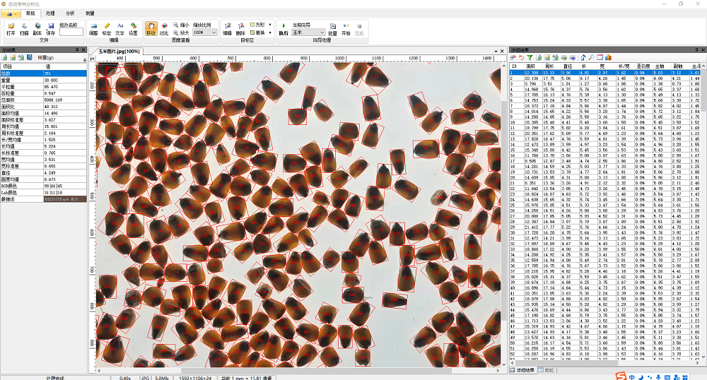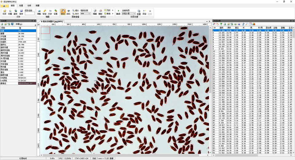 4、可根據實際需求自行創制一鍵自動分析向導,適用于水稻、小麥、玉米、豆類、油菜籽、瓜子、蔬菜籽等各類農作物的自動精確考種、各類糧庫的蟲口自動計數,以及出苗數、均勻度分析,顯示和輸出計數結果。